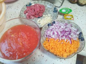 食材前期准备: 番茄烫后去皮,用料理机打烂;或者去皮后切成块,小火在锅里用铲子铲烂。 胡萝卜和洋葱切小丁。 牛肉切成小丁或小块,根据自己喜好。 半头蒜切成蒜粒待用。