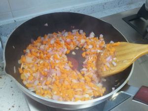 素粒预炒: 锅里下少许橄榄油(色拉油也可),油热后下蒜粒爆香;下洋葱翻炒;最后下胡萝卜炒至变色。盛起备用。