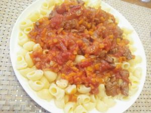 出菜: 沥干的烟斗面装盘,淋上做好的肉酱,完成。趁热比较好吃。