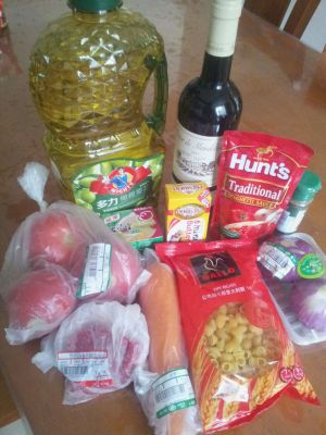 先给所有的材料来个大合照(浓汤宝不用,多买了) 食材购买(因为我不太喜欢在网上买吃的,所以东西都是在超市买的) 公鸡烟斗面、汉斯传统意大利面酱是在物美超市的进口产品区购买的;无盐黄油是在物美超市的牛奶冷柜区拿的,10克小盒装,实用。