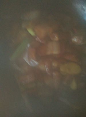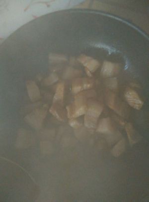 放入焯好的五花肉煸炒出多余油脂上色(如图)喷入少许白酒加入少许南乳,加入葱姜蒜少许花椒,小茴香,茶叶稍许煸炒加入开水,煮沸后加入盐、鸡精调味!放入高压锅二十分钟即可享受美食!