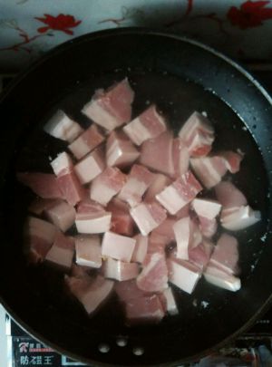 把五花肉切成小块凉水下锅加入姜片八角开过去除血末控干水份待用