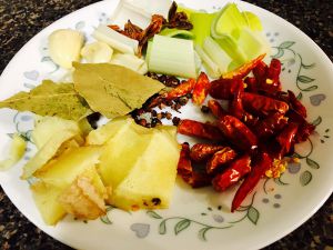 准备干辣椒,干花椒,八角,香叶,姜切片,蒜拍烂,葱切段作为底料