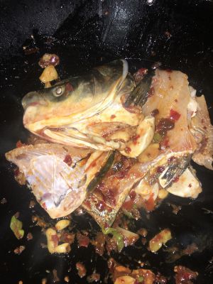 锅里下油、加入葱白、花椒、姜、蒜、爆香再加入火锅底料、豆瓣酱翻炒,加入鱼头鱼骨翻炒一下加入料酒.然后加水煮沸