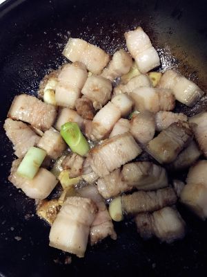 少放油,把肉,葱姜蒜冰糖同时下锅煸炒。一直翻,至冰糖融化。