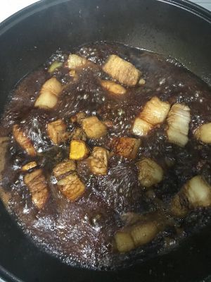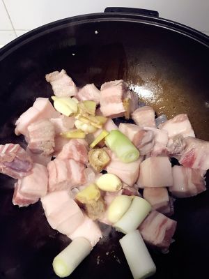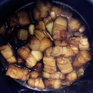 我的做法蛮简单的,就是把锅烧热,放点油烧热后放五花肉,我习惯是不炒的太久,到肉出油后滴点酱油,翻炒到肉上色。锅里加水中火慢慢煮。水只需盖住肉既可。大概到水煮的还剩三分之一时放调料。我只是做给自己吃的,男性也没那么精细,所有配料姜,蒜,八角是一股脑的倒下,再放点盐,鸡精,滴点生抽,酱油上色。PS :我个人喜欢是放点辣椒,不喜欢甜的,不然一般是在开始翻炒肉的时候放糖一起炒和上色入味。等到锅里的水差不多熬干时就可以起锅了。