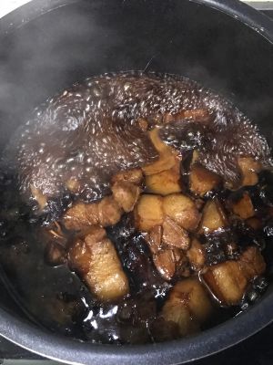 加入绍兴黄,讲究的可以放上等绍兴黄,我用的就是一般的绍兴黄,大概半瓶,水位基本和肉平,所以就不用防水了!没有就放普通料酒!生抽,记住,咸味主要来自生抽;老抽,主要上色用;红烧酱油,提提味儿!至于比例吗……需要您自己尝尝!一定要甜,如果不够甜,在此再加白糖调调!