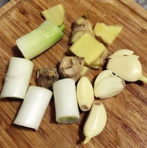 大晚上的没有小葱,大葱替代。葱姜蒜,不用切细,大块一点。