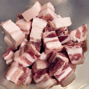 五花肉洗净,切块。大小看自己喜欢,我喜欢吃大块的,大概2厘米*3厘米吧