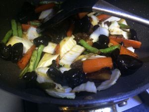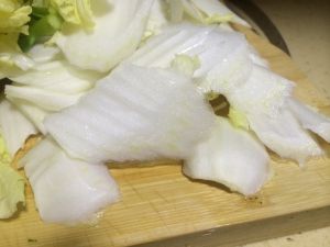 加入白菜帮和木耳混匀,煸炒到白菜帮有些变色