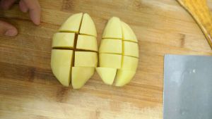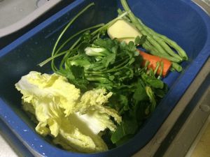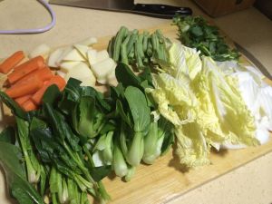 土豆、胡萝卜、豆角都切成差不多大小的条。白菜叶子和梆分开,菠菜和油菜个子太大就切两半