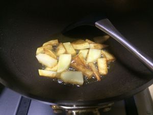 等肉炒到略带焦黄色 倒入冰糖 料酒 生抽 老抽