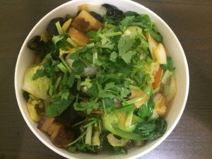加入白菜叶、菠菜、油菜混匀煮熟,少许白胡椒和盐调味