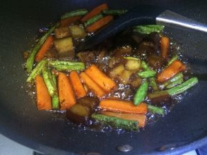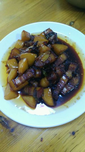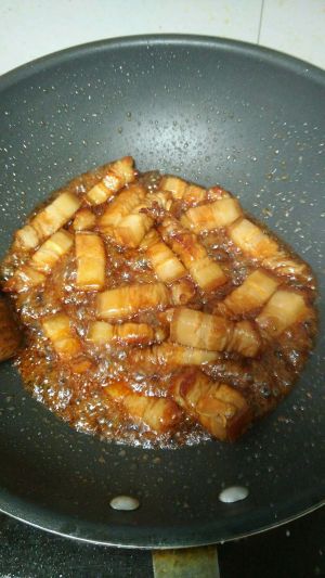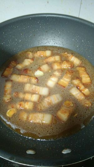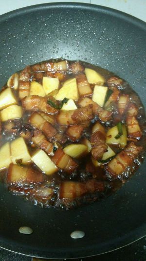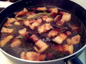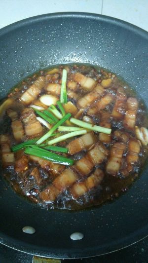 加入葱段,如果颜色不够深可以再加入一丁点的老抽调色。不要多~大火烧开后转中小火收汁。大概25分钟。