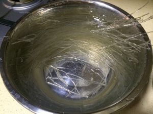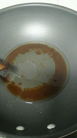国内放入10ml的油,加入冰糖,小火将冰糖熬煮化开成焦黄色快冒泡。