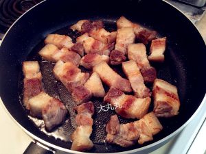 锅烧热,倒入很少量的油再将五花肉放入,煎至五花肉变黄出油。
