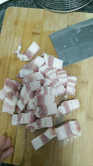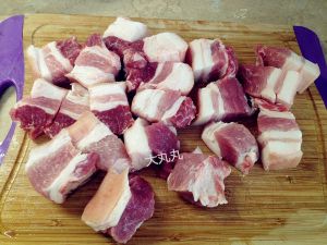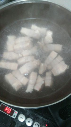将五花肉放热水里焯一下,放入一点料酒盐生姜,捞起再用水冲掉表面的浮末。沥干水备用。
