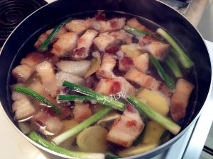五花肉块冷水入锅,加入料酒、姜、花椒焯水后捞出洗去浮沫。