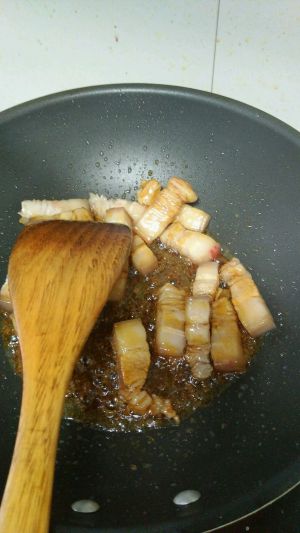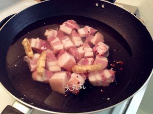 (图片没拍清楚)等姜和蒜白炒出香味 倒入五花肉