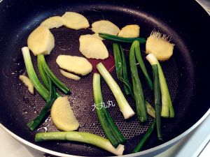 猪油在锅里化开后 放姜和蒜白下锅煸香