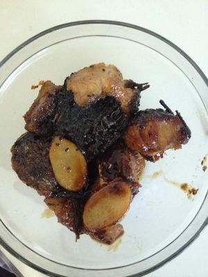 在放酱的碗里加少量淀粉和水,调匀,倒在锅里,收汁。我收汁收的不好,太粘稠了,不过也没太大影响。