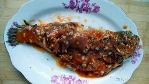 倒出部分油,留个底,葱姜蒜爆香,倒入拌好的糖醋汁,拌匀,热后,浇淋鱼身上,OK