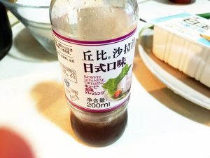 把皮蛋和豆腐火腿拌在一起,最后加入沙拉汁和葱花