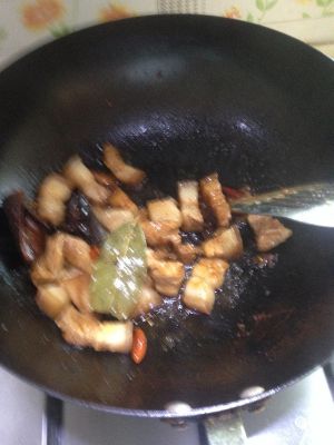 爆香葱姜蒜干辣椒,记得炒糖色。放入肉,加料酒和酱油,炒匀,加开水,没过肉块。