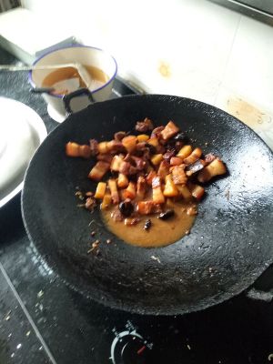 把飞水后的花肉加下锅中火快速翻炒均匀加入所有辅料