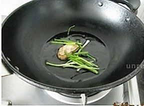 葱切段,姜拍扁。炒锅烧热,小火将葱段、姜块煸出香味。