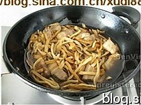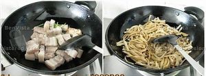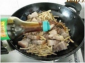 倒入肉块煸炒出油,加入萝卜干炒香。