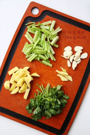 香芹切段,土豆去皮切粗条,香菜切段,姜蒜切片;