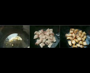2.锅内热油,放入冰糖,一定要小火,等冰糖炒出糖色时倒入五花肉,炒出油变色。