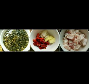 1.梅干菜用水泡两个小时左右,切好姜片 蒜片 辣椒段,五花肉切丁