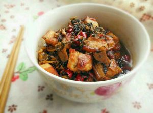 3.加入老抽上色,倒入香料炒香,再加入梅干菜翻炒均匀,加入适量水煮开调味,装入碗中,有电压锅现在压18分钟,到了时间出锅即可。