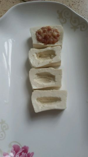 然后在豆腐中间挖个小洞,这样肉馅就不会掉出来。