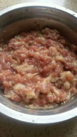 把肉剁碎,剁肉时把葱头跟肉一起剁。把剁好的肉放入盐,鸡粉,鸡蛋,生粉,胡椒粉,蚝油,顺着一个方向搅拌均匀。