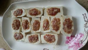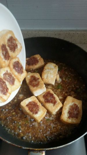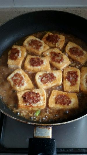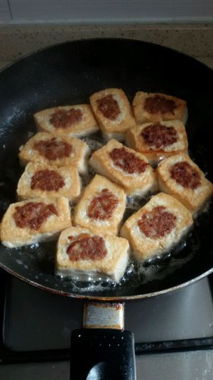 把拌好肉馅放到豆腐里。然后锅里放入油烧热,把有肉馅的那一面先煎。