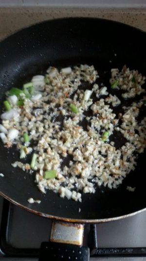 猪肉绞碎、鱼肉绞碎、香葱切粒、然后加入调味料用筷子搅拌均匀。