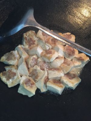 豆付均匀切成小方块或对角切成小三角,(不熟手的可用平底锅)热好油锅,可先暂熄火:将肉馅料轻塞入豆腐内,酿塞好逐个放入锅里,一个紧挨着一个,注意让有肉馅的一面朝锅底,开火慢火煎,煎的时候转动调换一下煎锅受热的位置,让酿豆腐尽量均匀受热,煎至有肉馅那面金黄,煎好翻起来是这样的↑