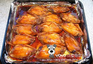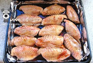 烤盘上垫锡纸,边缘折一下码上淹好的翅中,220度上下火先烤15分钟