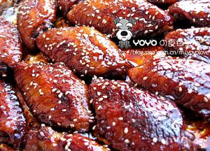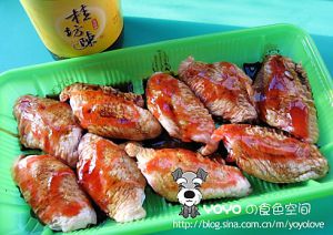 翅中涂叉烧酱、蜂蜜、生抽、老抽、黑胡椒,最后淋一些桂花酒,淹1小时