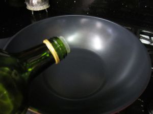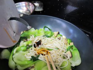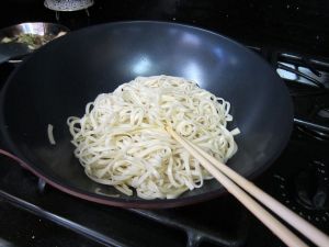 重起油锅,等油温达到8分热时放入面条,用筷子拌炒一下。