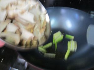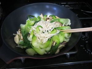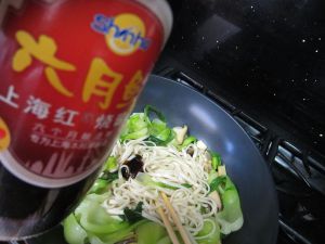 加入焯烫好的青江菜和杏鲍菇拌炒匀。