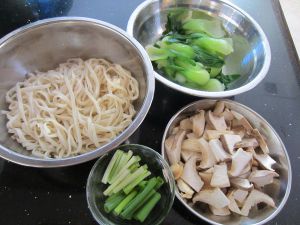 先将面在沸水中煮到8分熟捞起,过一下凉水,滗干水分后,滴上半茶匙油防止面条凝结起来。青江菜也要焯烫一下,过凉水,杏鲍菇切片,我选用的是杏鲍菇的头和尾。葱切寸段。