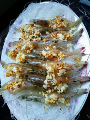 粉丝垫底,码好虾,虾背放蒜末(炸好的和未炸的另一半混合的)
