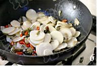 水分差不多快收干时,下入扒过的肉片,加适量鸡精、胡椒粉调味,然后翻炒均匀即可出锅。
