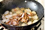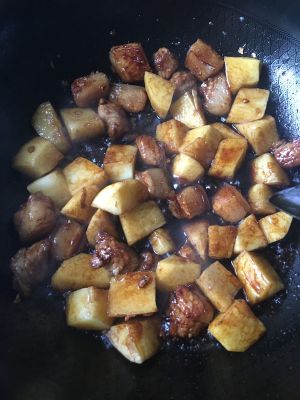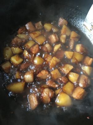 等土豆上色后倒入温水没过土豆和五花肉,放入桂皮,葱结,小火慢炖,炖十多分钟撒入少许鸡精翻炒一下,继续小火慢炖,炖到汤汁收干即可