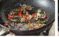 将肉盛起,将扒肉的油倒入炒锅,大火烧热后下入小米椒、大蒜末和腌菜煸炒出香;