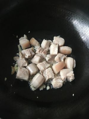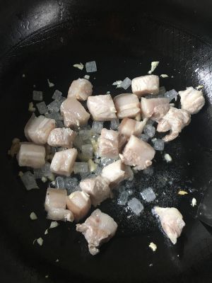 锅中倒入少许油,放入生姜,大蒜爆香再倒入洗净的五花肉大火翻炒